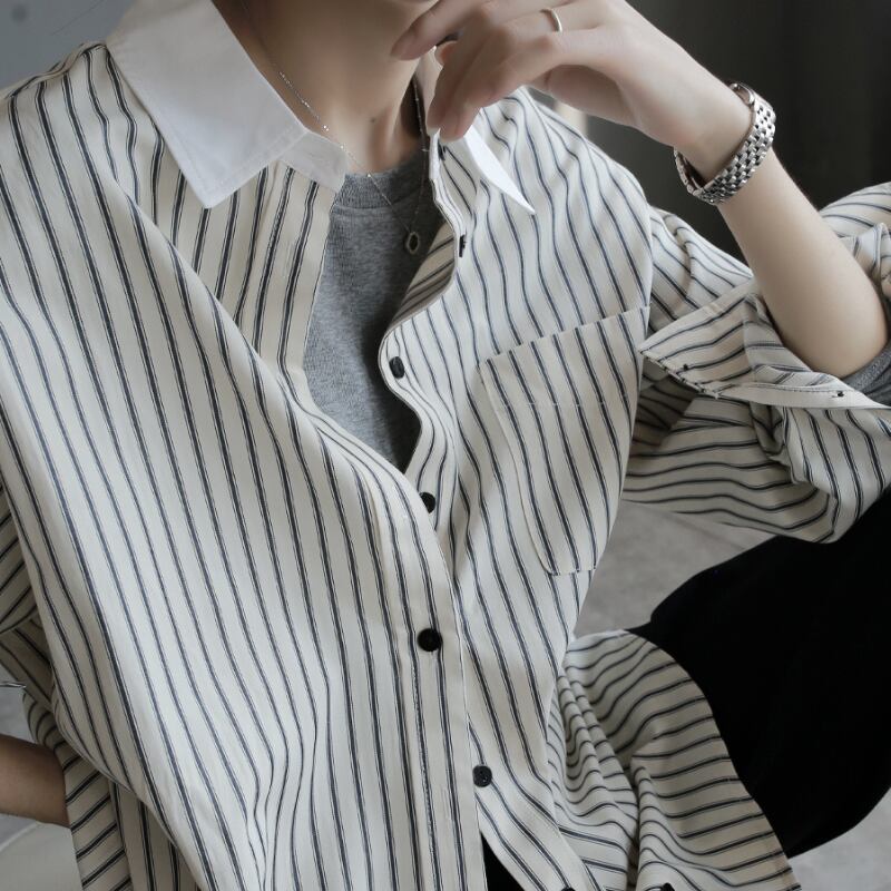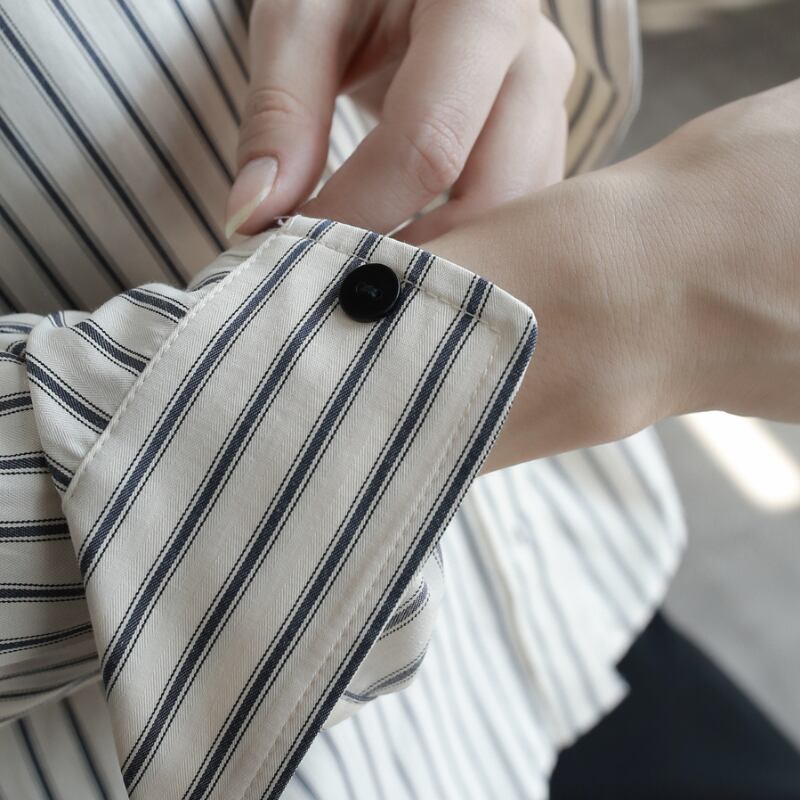 シャツカラーのデザインがきちんと感を演出し、カジュアルながらも上品な印象に。
