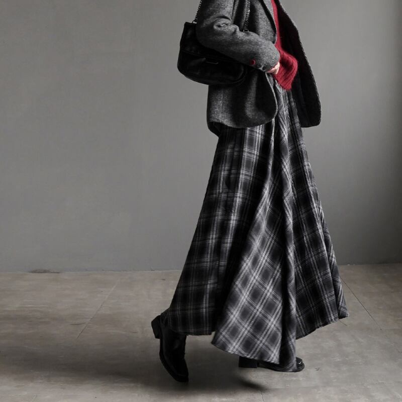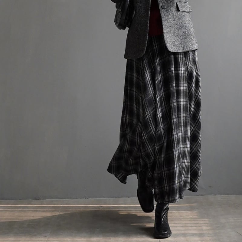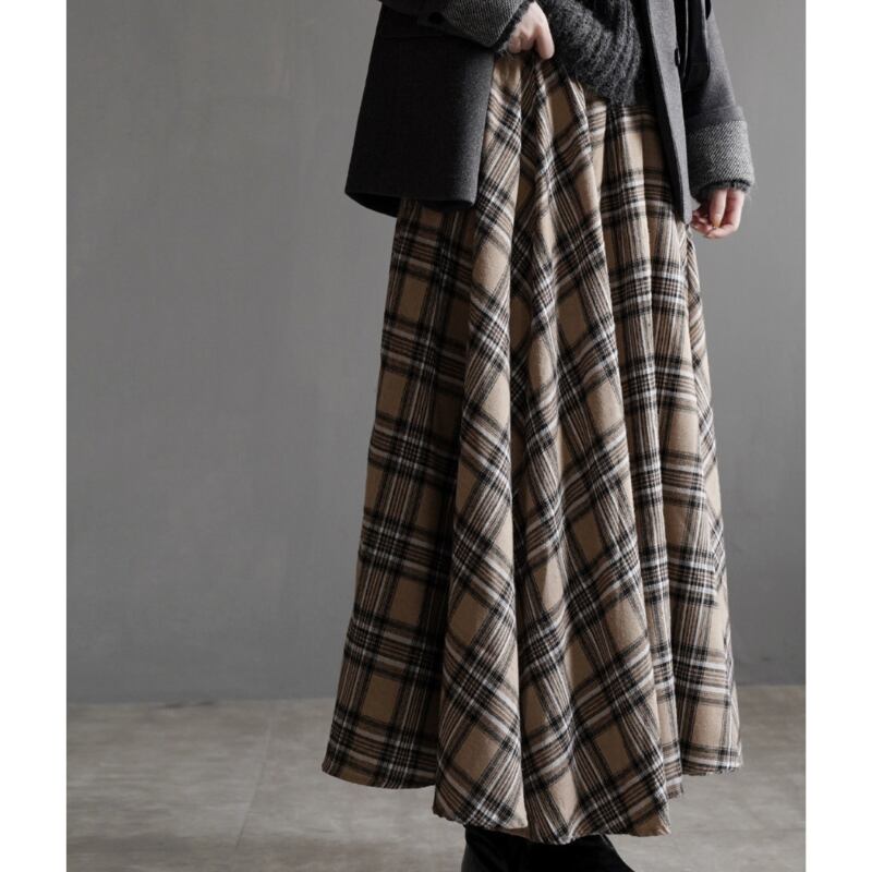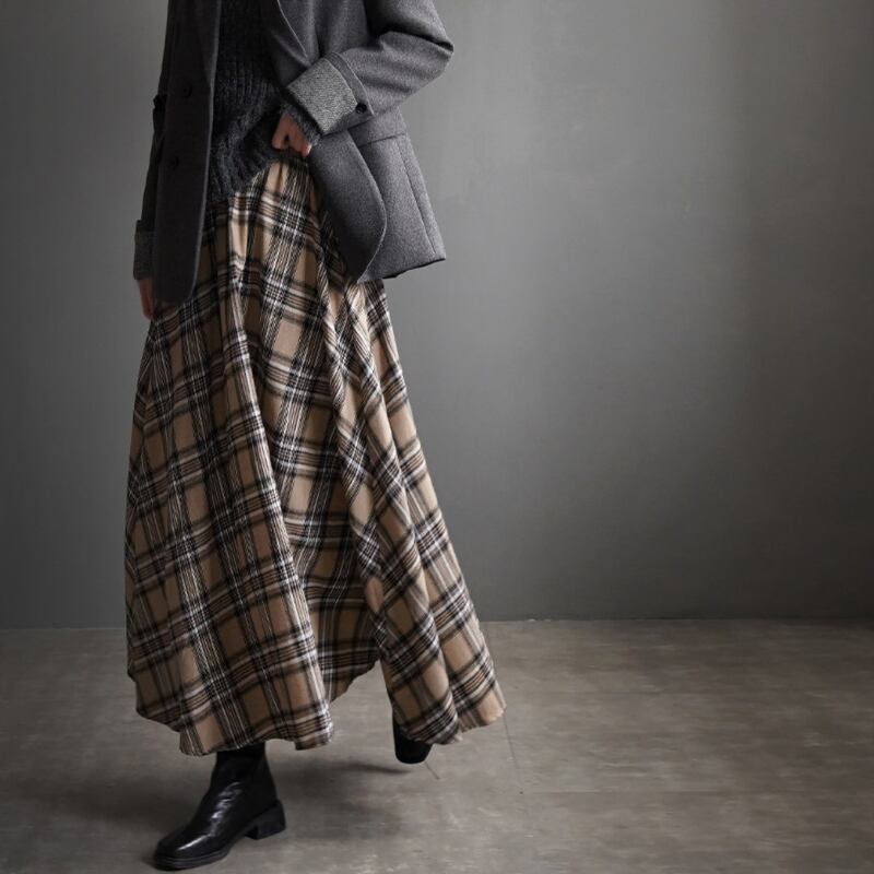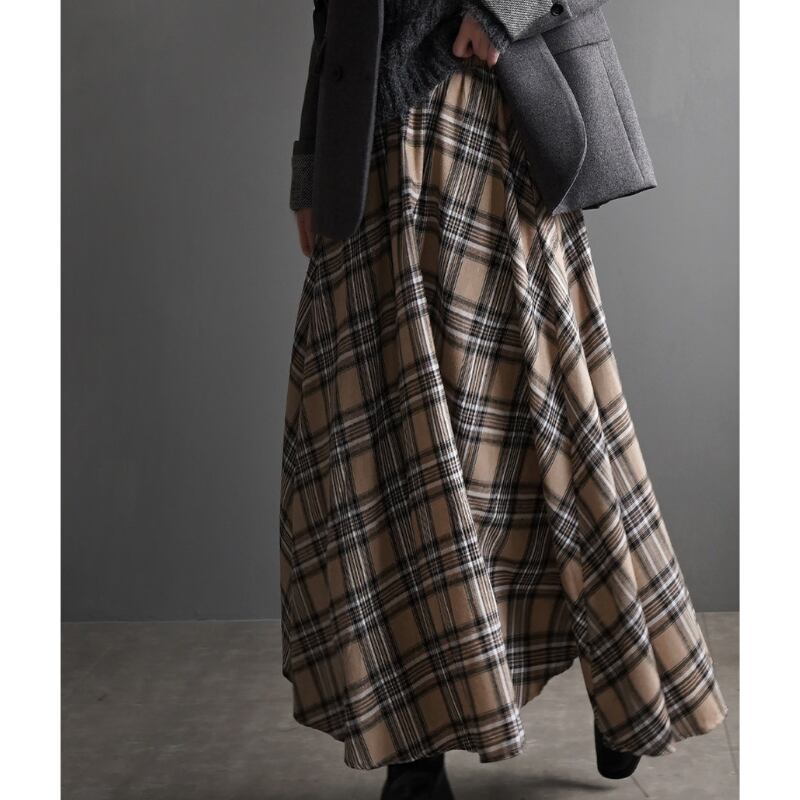 クラシカルなチェック柄が魅力的なフレアロングスカート。