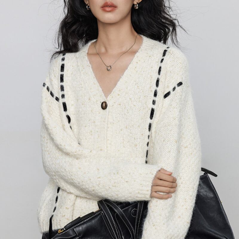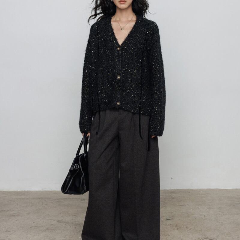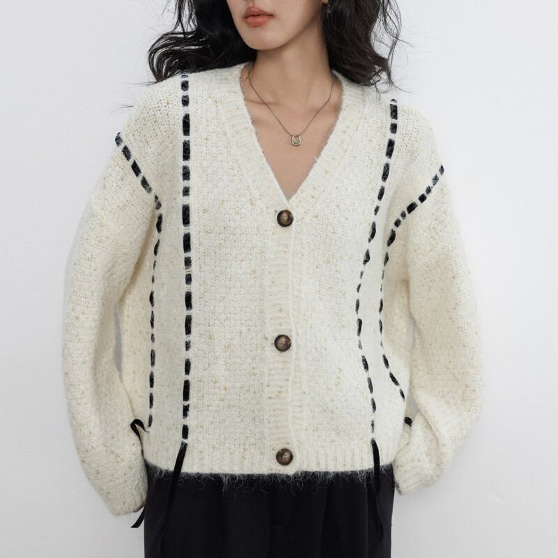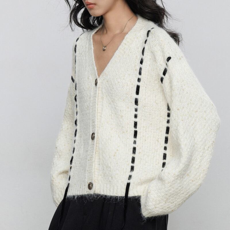 程よく開いたVネックが、デコルテラインをすっきりと見せてくれるニットカーディガン。