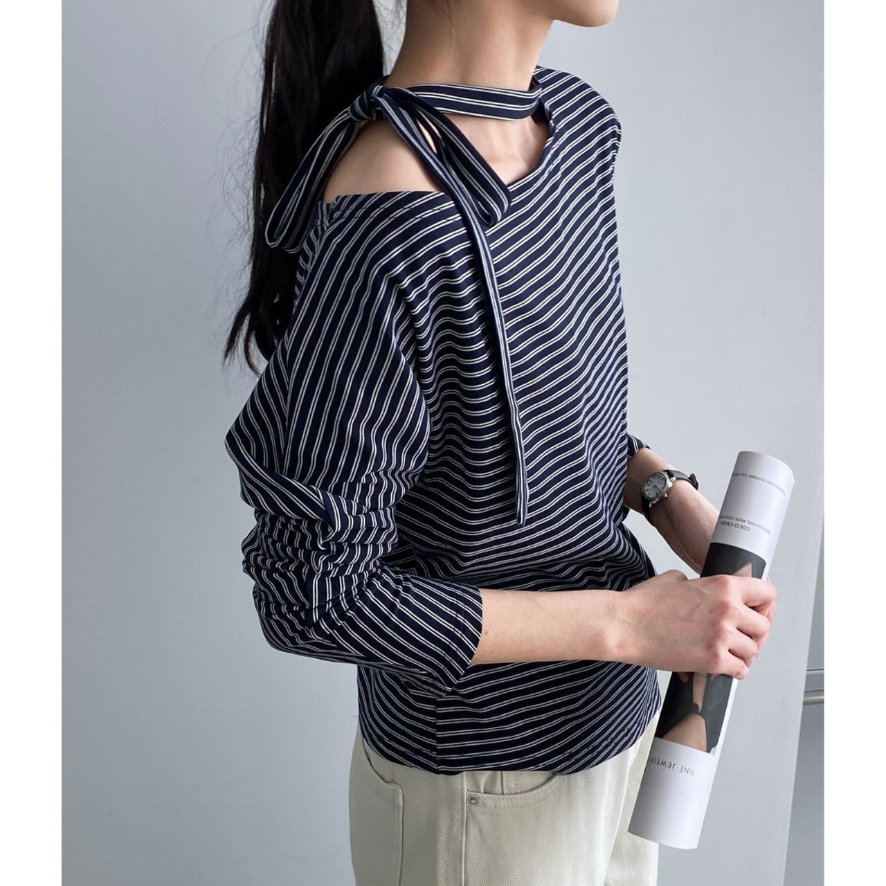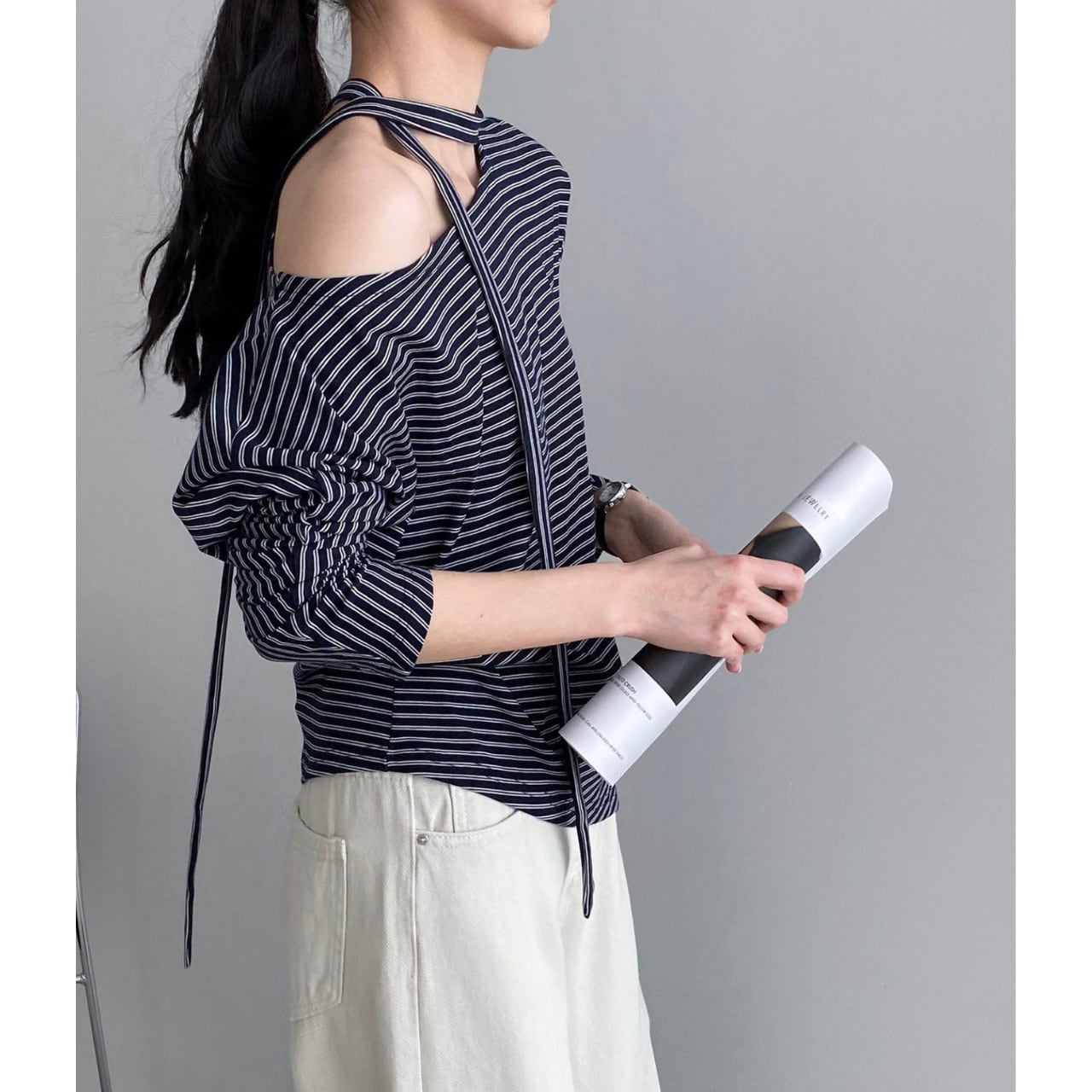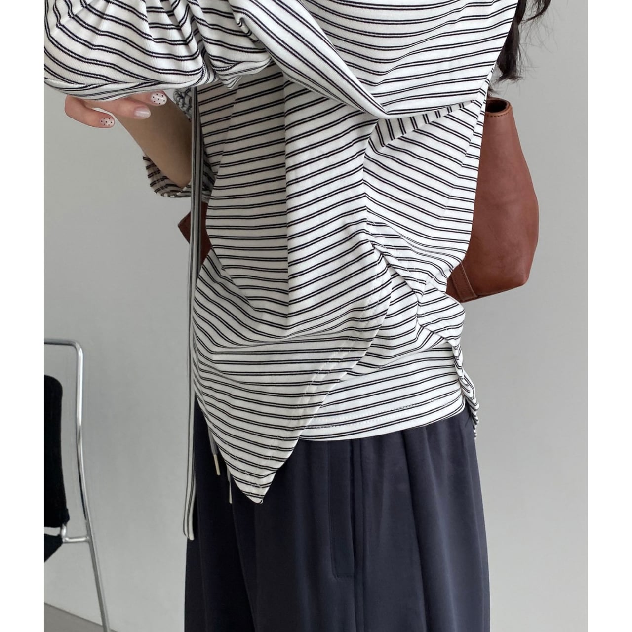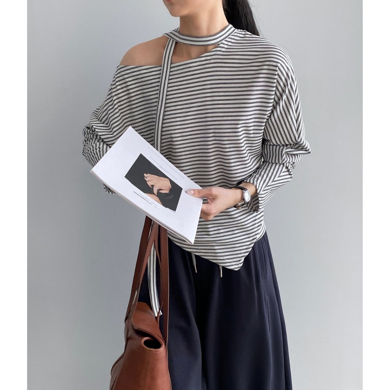 ストライプ柄がアクセントになり、シンプルなスタイリングもこなれた印象に。