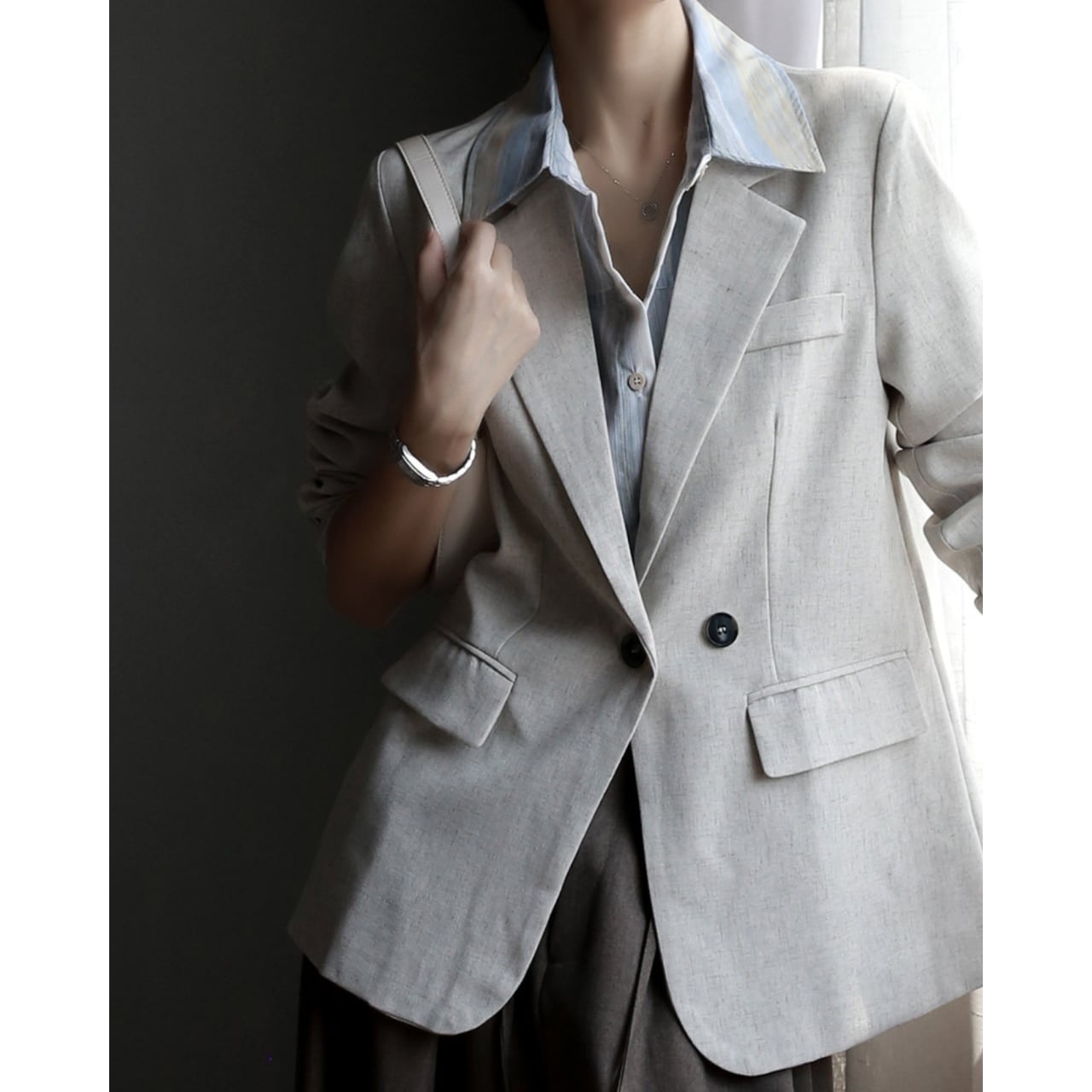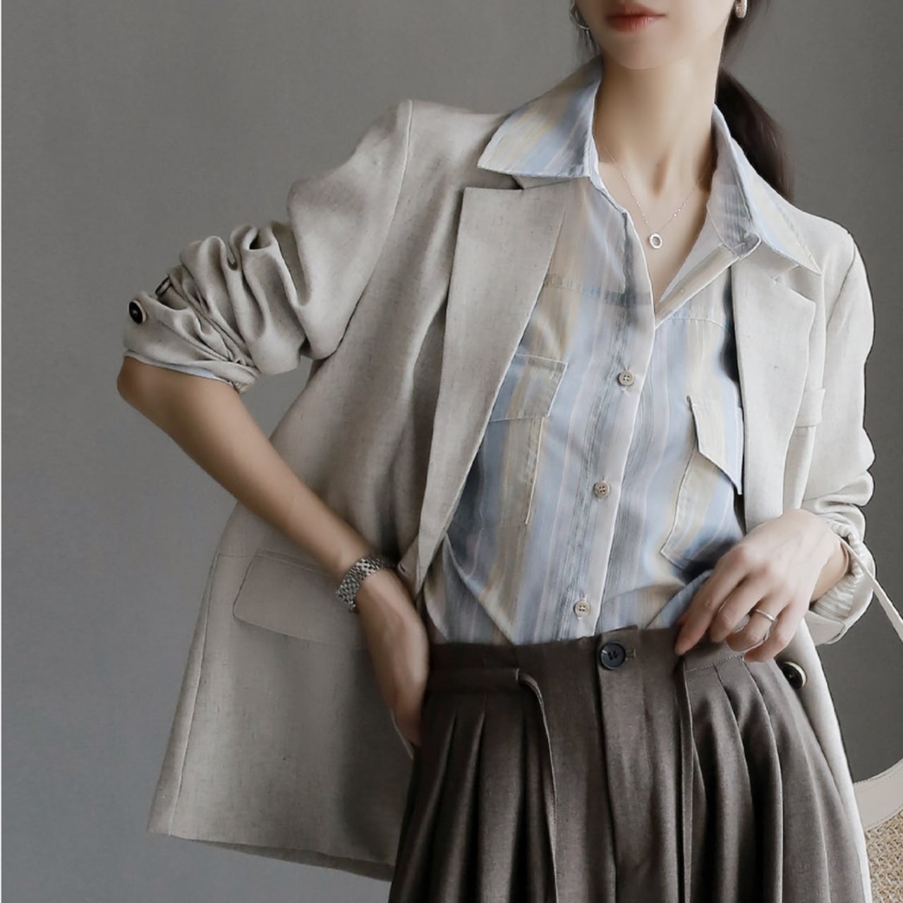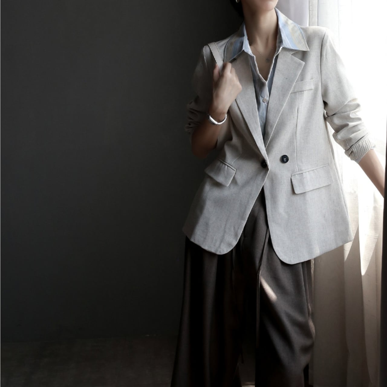 袖をまくってこなれ感を出すのもおすすめ。