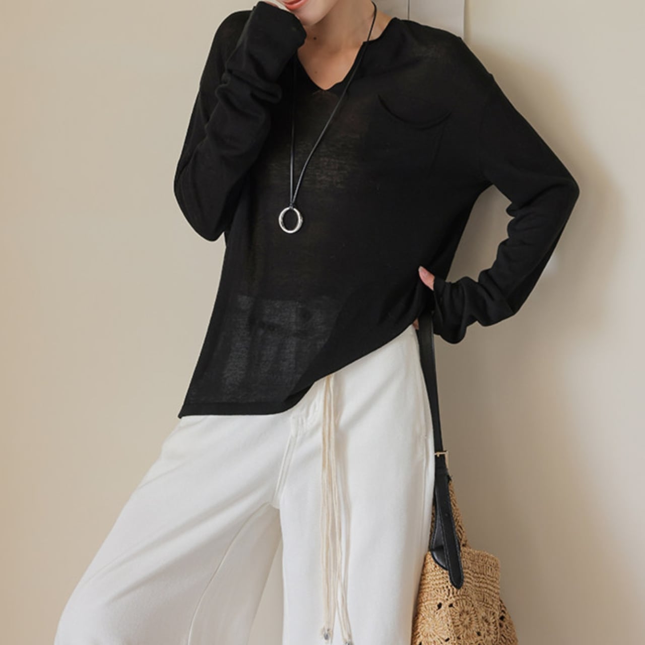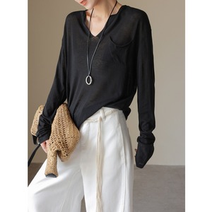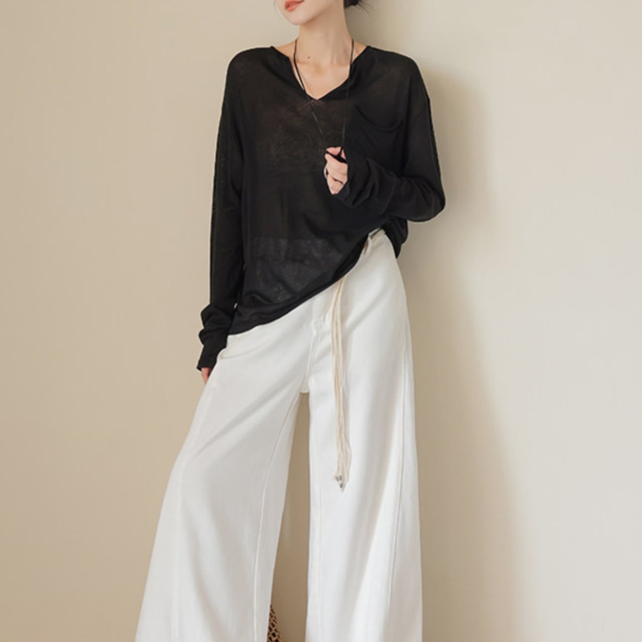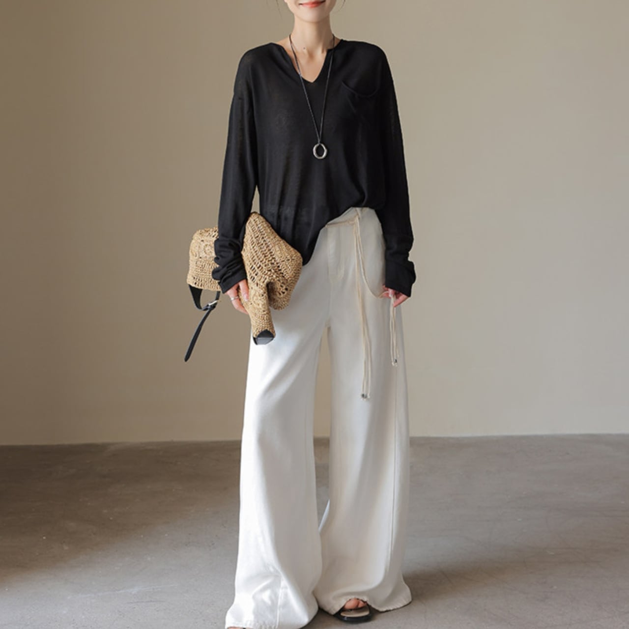 ゆったりとしたシルエットと、抜け感のあるVネックが頑張りすぎない大人の余裕を演出。